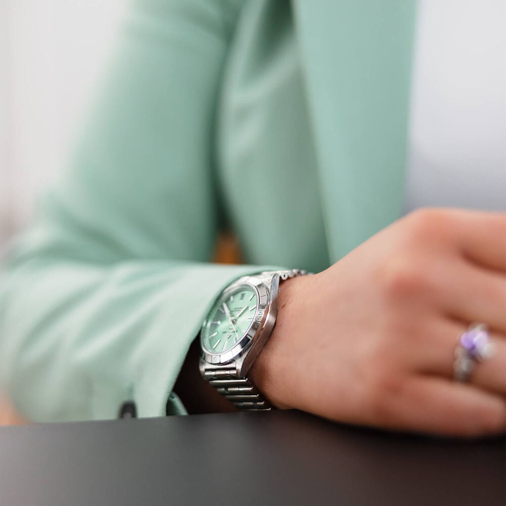 The new ladies Chronomat introduced by Breitling embodies sophistication with confidence and active lifestyle. This variaton features a laquered pale green dial with baton indices housed in a stainless steel case and fitted with a rolaux stainless steel bracelet. Order yours today!