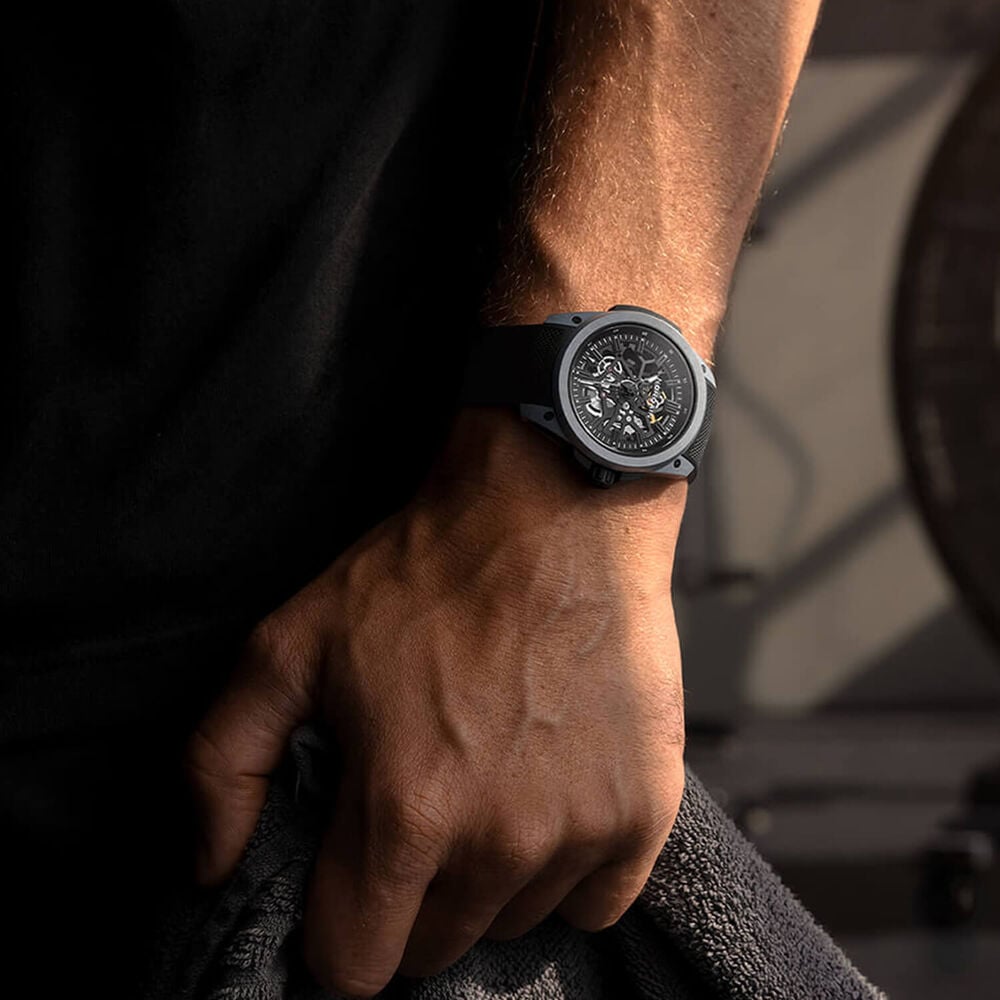 The NORQAIN Wild ONE Skeleton delivers ultra-light performance and rugged durability with a sleek, monochromatic aesthetic. Its 42mm case is made from NORTEQ, NORQAIN’s exclusive carbon fibre composite, weighing just 84 grams and engineered to withstand shocks up to 5,000g. The skeletonised grey dial showcases the COSC-certified Calibre NN08S automatic movement, with a 41-hour power reserve, visible from both the front and sapphire crystal caseback. A grey rubber shock absorber reinforces the case structure while adding visual depth. Paired with a matching black rubber strap with Milanese-style texture and secured by a NORTEQ pin buckle, this Wild ONE is designed for high-impact adventures with understated style.