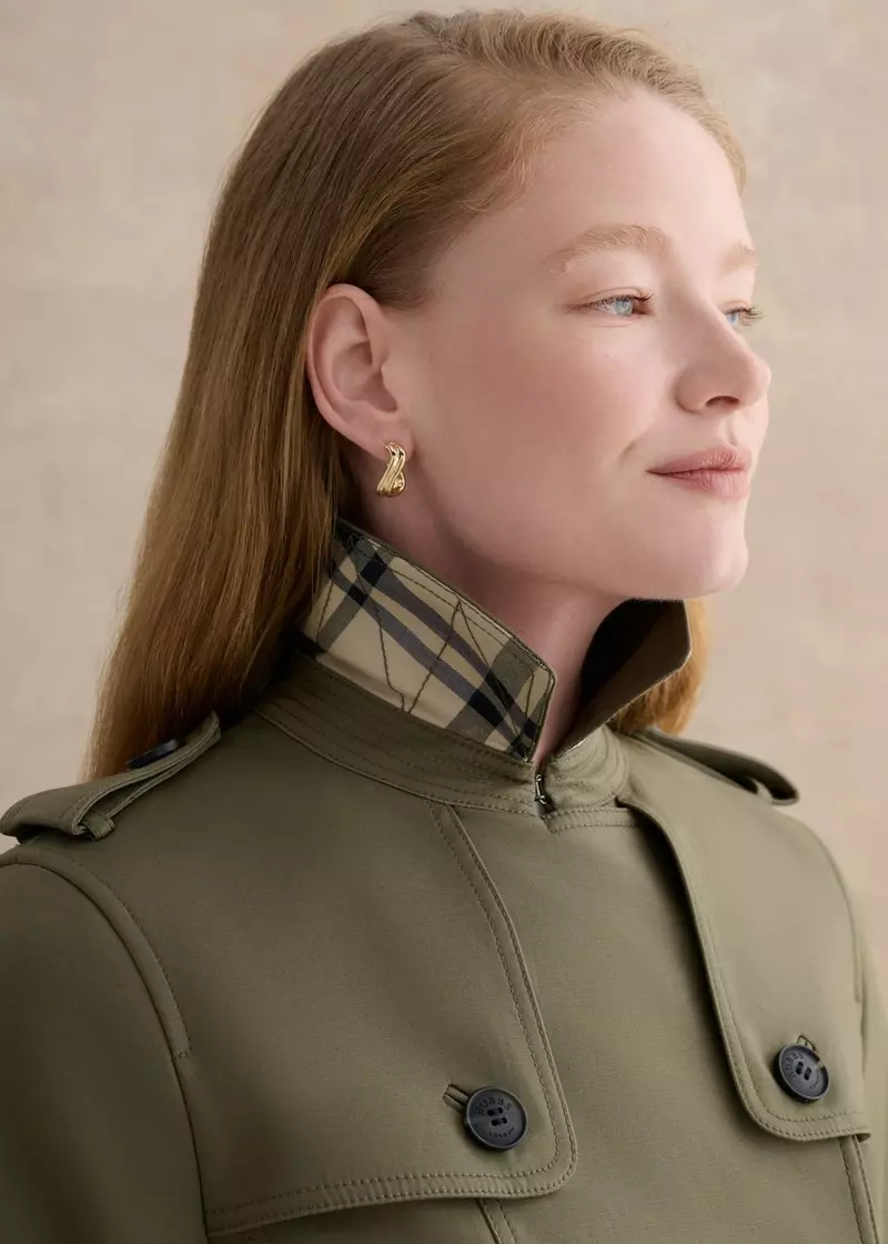 - Double-breasted with branded buttons